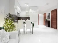 Le salon avec de grandes fenêtres permet beaucoup de lumière du jour, et la kitchenette est équipée d'appareils ménagers - lave-vaisselle, réfrigérateur, four ou plaque d'induction.