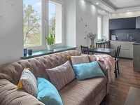 L'appartement se distingue par un salon ouvert qui combine le salon avec une cuisine entièrement équipée, créant un intérieur spacieux et fonctionnel, idéal pour passer du temps ensemble. Dans les deux chambres, parquet en chêne et seuils de fenêtres en granit.