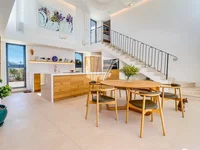 Au rez-de-chaussée, vous êtes accueilli par un élégant hall d'entrée menant à un salon spacieux et lumineux avec une cheminée (système de récupération de la chaleur). L'espace social est complété par une cuisine moderne et entièrement équipée avec de hauts plafonds qui ajoutent de l'élégance et un sens d'ouverture, parfaitement intégrée à la salle à manger dans un plan ouvert. Cet étage comprend également deux chambres (une en suite et l'autre avec accès direct à une salle de bains complète), une buanderie pratique, et un accès direct à un garage fermé avec espace pour deux voitures et une moto.