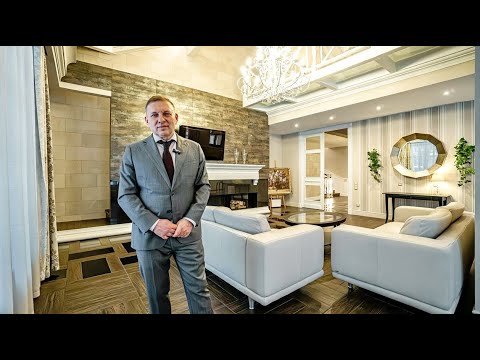 Décoration d'intérieur : finition coûteuse. Le vitrage panoramique du 1er étage remplit la maison de lumière. Les murs sont plâtrés et peints avec des peintures anglaises Little Green en combinaison avec du papier peint vintage de production anglaise: Wild Garden, Glarke@Glarke, Architector, Balmoral et moulures murales. Dans les salles de bains tuiles Ceramica Vogue (Italie). Les murs de la piscine sont bordés de granit Happywood Wenge, Apavisa Nanoeclectic Mohave + Mosavit mosaïque de verre. Sur le sol porcelaine stylisée porcelaine (imitation de pierre) production italienne Novabel + planchers chauds d'eau. Les étages des chambres du 2ème étage sont un panneau massif en parquet fait de noix américaines. Grand escalier avec marches en céramique italienne Novabell Gradino Wen, balustrade réalisé à la commande. Les plafonds sont multi-niveaux de la GKL, avec éclairage et éléments de poutre (en style chalet). Plomberie Laufen (fabriquée en Allemagne). Les portes intérieures sont faites d'un tableau de couleur blanche. Les seuils de la fenêtre sont en bois. Trois cheminées sont toutes de type guillotine. La cheminée dans le salon M-Design (France) est à deux côtés, avec un grand portail bordé de granit italien. Cheminée au sous-sol de la production tchèque Bef Home Bef Start. Troisième cheminée dans le bain. .