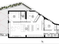 La terrasse offre un haut niveau d'intimité grâce à des arborescences vertes et une verrière de cassette pour réguler la lumière du soleil. La superficie totale de l'appartement avec un garde-manger est de 186.3 m2. L'appartement est orienté sur deux côtés: la zone de couchage fait face au nord-est, et la terrasse et le salon - à l'agréable nord-ouest.