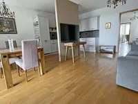 En entrant par l'entrée principale au 5ème étage, vous trouverez un salon accueillant et lumineux avec une cuisine ouverte, deux petites chambres et une salle de bains avec baignoire. Chaque chambre dispose de son propre balcon, offrant une lumière naturelle et de l'air frais toute la journée.