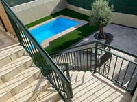 The plot surrounds the entire house, there are squares for two cars, private pool and barbecue area.