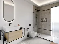 Salles de bains avec cabines de douche, lavabos, miroirs et éclairage LED encastré dans le faux plafond inclus.