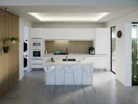 Cuisine avec hotte aspirante, éclairage LED encastré dans le plafond inclus.