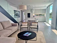 Le niveau inférieur comprend une 3ème chambre optionnelle ou un bureau lumineux, l'espace de vie et la cuisine sont lumineux et spacieux avec de grandes portes ouvrantes sur un jardin privé où vous pourrez profiter de repas en plein air avec plus de 350 jours de soleil par an. Le salon dispose d'escaliers ouverts menant à 2 chambres avec salle de bains privative. Les avantages des systèmes de climatisation et de chauffage sont installés à un niveau élevé partout. Les salles de bains équipées sont en porcelaine Keraben antidérapante dans un fluide gris doux dans toute la maison,
