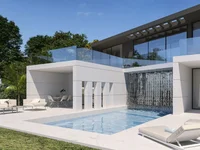 New Build Villa moderne répartie sur 2 étages, avec 4 chambres, 4 salles de bains avec placards et terrasses, cuisine ouverte avec salon avec grandes fenêtres et accès direct au jardin avec piscine et parking.