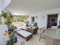 L'appartement dispose d'une vaste terrasse privée de 30 m2 qui vous invite à vous détendre ou à vous divertir tout en profitant d'une vue ininterrompue sur les montagnes, les forêts luxuriantes et la mer Méditerranée.