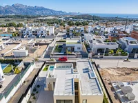 Le solarium sur le toit offre un vaste espace extérieur avec vue panoramique sur la mer et est prêt pour l'installation future de panneaux solaires. Une cuisine extérieure, de nombreux casiers de rangement et un jardin paysager de style méditerranéen avec irrigation automatique complètent l'extérieur.