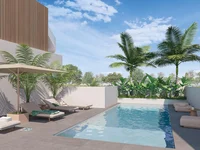 The exterior spaces continue the interiors and offer a private garden ideal for your own green oasis or sitting with friends, a spacious terrace for relaxing and al fresco dining, and a practical solarium as a place for sunbathing and evening stargazing. The community areas of the complex are complemented by well-kept gardens and a communal pool, which encourage neighborhood gatherings and offer a place to relax without having to travel far.