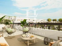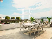 Appartement moderne en rez-de-chaussée avec grande terrasse, situé dans une résidence de standing à proximité de la mer, avec piscines et salle de sport.