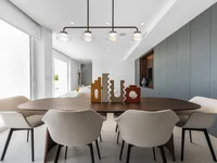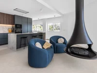 Le rez-de-chaussée de cette maison dispose d'un vaste salon-salle à manger ouvert sur la terrasse et sur la grande cuisine avec un îlot central comprenant la zone de cuisson et un grand comptoir de petit-déjeuner, un espace ouvert et communicant qui crée différentes ambiances. Tout cela avec un design intérieur commun mettant en avant le noyer, des éléments décoratifs gris, une énorme cheminée indépendante et de grandes fenêtres qui se dissimulent, unissant l'intérieur et l'extérieur et créant un espace de grandes dimensions, à apprécier pratiquement toute l'année, grâce au merveilleux climat méditerranéen qui inonde la maison de lumière.