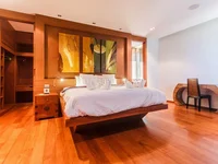 Chambre principale au troisième étage de style Loft avec douche intérieure et en plein air, comptoir bar extérieur avec mobilier et machine de fitness elliptique
