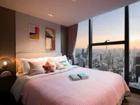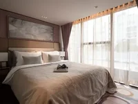 Feel right at home in this thoughtfully designed 59 sqm condo in the heart of Khlong Toei Nuea.The living room's probably where you’ll spend most of your downtime. It’s modern but cozy, with a beige sectional sofa perfectly placed to face a wall-mounted flat screen TV set against a marble accent wall—adds a touch of luxury without feeling cold. Dark wood paneling on the walls and wooden flooring keep things warm, while the ambient ceiling lighting and those large windows with sheer curtains fill the room with a soft, natural light.The kitchen is sleek and practical, featuring an L-shaped layout with dark wood, handleless cabinets and a light, solid surface countertop that’s easy to clean. Under-cabinet lighting brightens the prep space, and you’ve got all the essentials like a built-in induction cooktop and a stainless steel microwave seamlessly integrated into the cabinetry.Both bedrooms are well-sized, with the master offering a walk-in closet that’s a real highlight—built-in shelving, integrated LED lights, and plenty of hanging space make organization a breeze. There’s even a vanity area with a round mirror and recessed lighting. The bathroom is modern, with a glass-enclosed shower, bidet toilet with controls, and sleek fixtures.This offplan unit is freehold, so you’re set to move in or rent out as you please. It’s a great blend of style and function if you want something contemporary in a lively Bangkok neighborhood.