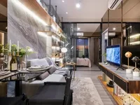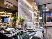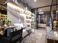 A compact but thoughtfully designed spaceThis 35 sqm condo in Phra Khanong feels way bigger than it is, thanks to the open-plan living and dining area combined with floor-to-ceiling windows that bring in plenty of natural light and offer a great city view. You’ll probably spend most of your time here—the marble accent wall with integrated lighting and the modern sofa make it a comfortable, stylish spot to unwind.Smart separation between living and sleepingInstead of a traditional door, there’s a sliding glass partition between the living room and the bedroom. It gives you privacy without closing off the light or space. The bedroom itself feels cozy with a double bed, blackout curtains, and a walk-in closet with glass-front cabinets illuminated from within, so finding clothes is a breeze.Modern touches throughoutWooden flooring and an area rug add warmthCeiling recessed and ambient lighting create a soft, inviting atmosphereAIR conditioning units in both living and bedroom areas keep things coolGlass-enclosed shower area in the bathroom is sleek and easy to maintainAll in all, this place blends modern convenience and smart use of space, perfect if you want an easy-to-live-in, low-maintenance home with a nice view right in the heart of Bangkok.