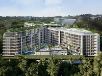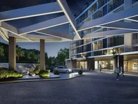 The condominium offers residents a variety of amenities including four swimming pools, highlighted by a rooftop infinity pool with a lounge area, a fitness center, lush courtyard gardens, and communal recreation spaces designed for relaxation and socializing.