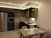 Meublé appartement d'une chambre (1+1) d'une superficie de 58 m2, mobilier neuf, planchers chauffés. Vue depuis l'appartement jusqu'au territoire luxueux du complexe.