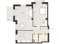 Chambre lumineuse. Studio de cuisine confortable. Couloir spacieux. Le vestiaire est fourni. Deux salles de bains.