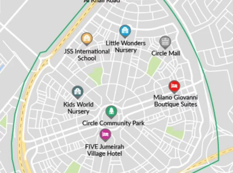 Jumeirah Village Triangle. It is well connected to major highways, providing easy access to various parts of the city. Jumeirah Village Circle is known for its landscaping and green spaces. The development includes parks and common areas for residents to enjoy