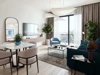 The residence features green areas with jogging and bike paths, kids' playgrounds and sports grounds, shops, a swimming pool, a gym, restaurants and cafes, a barbecue area, a mosque.