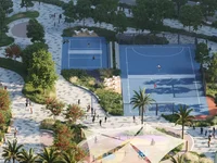Mélange de bâtiments résidentiels, points de vente, attractions de loisirs et espaces verts