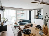 Cet élégant appartement de 3 chambres, 2 salles de bains offre une vie moderne avec une disposition étendue de 946 pieds carrés, situé au 8ème étage. Profitez de votre propre balcon privé avec vue sur l'Est, parfait pour manger al-fresco ou se détendre. L'appartement dispose d'intérieurs contemporains avec une cuisine Bosch entièrement intégrée, y compris un refroidisseur de vin et des plans de travail en pierre composite. La chambre principale comprend une armoire et une salle de bains, tandis que la deuxième salle de bains sert les autres chambres.