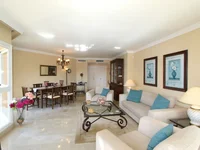 L'appartement dispose de 3 chambres spacieuses et 2 salles de bains, un grand salon et salle à manger avec accès à la terrasse orientée est qui a des carreaux de céramique, rideaux en verre et une vue partielle sur la mer. Les deux salles de bains, dont l'une est en suite, ont des douches avec des têtes de douche.