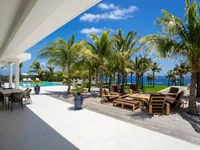 The pool deck features outdoor living areas, a dining portico, surround sound system and surf sounds.