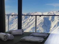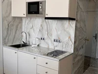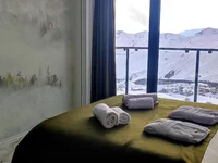 Premium class room with designer renovation using high-quality materials. With a view of the mountains, fully equipped with furniture, appliances, textiles and all necessary kitchen utensils. Bed with an orthopedic mattress of increased comfort. Soft wall panels (made in Italy). Floor and walls - porcelain stoneware (made in Italy). Available: microwave oven, kettle, refrigerator, BEKO electric stove, Gorenje washing machine, electric boiler. Electronic lock. Doors in the bathroom are hidden (made in Italy). There is a SKI Depo (ski locker)