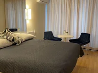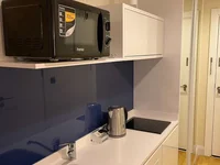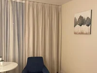 The apartment is newly renovated. The studio has everything you need for living and renting: a washing machine, a microwave oven, dishes, an iron, as well as an additional folding chair.