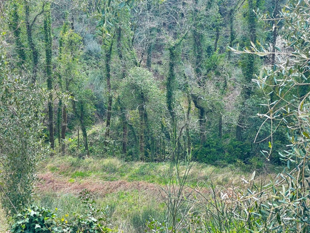 The plot is divided into two sections by a municipal road , which provides easy access to both parts. The terrain is varied and partly sloping , with a large portion extending up the hillside, offering a sense of privacy and harmony with the surrounding landscape.