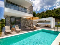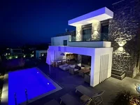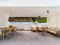 The villa's 550 m² of exclusive outdoor space creates a private Mediterranean sanctuary designed for effortless entertaining and relaxation. At its heart, a 3m x 7m pool constructed in concrete and marble provides a refreshing escape, surrounded by generous deck space for sunbeds and lounging. The architectural highlight is a striking 30 m² concrete pergola that extends the living area outdoors, offering a sophisticated shaded retreat. This versatile space can comfortably accommodate a 12-person dining table and a generous corner lounge set - perfect for long summer evenings with family and friends.