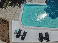 The villa's expansive outdoor space is designed for effortless entertaining and relaxation. Two outdoor dining areas provide ample space for al fresco meals, while a comfortable lounge area invites you to unwind and soak in the tranquil atmosphere. A sparkling private infinity pool, surrounded by sunbeds, creates a fabulous setting for sunbathing and relaxation. A poolside bar allows you to sip cocktails under the stars while enjoying spectacular sea views. A pool shower, fully equipped BBQ area, outdoor WC, and parking for three cars complete the outdoor amenities.