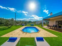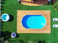 6x4 m. swimming pool with 4 sunbeds, 2 chaises longues, and life ring