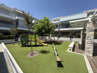 The price includes a solar water heating system, air conditioners in each room, a fitted kitchen with built-in appliances, one parking space, a shared swimming pool, and a children’s playground.