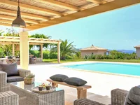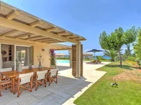 The villa spans a 2000 sq.m. plot, featuring an impressive environment with a pool, tiled patio, wooden lounge chairs, and large umbrellas providing shade. The house, with a total area of 270 sq.m., combines stone and wood in its exterior design, creating a harmonious relationship with nature. The interior boasts spacious rooms with high-quality materials like marble and wood, and large windows that allow plenty of natural light.