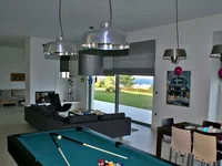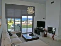 The villa features modern architecture with white ceramic flooring and spacious verandas offering unobstructed views of the Corinthian Gulf. The garden is well-maintained with green lawns and decorative plants, while the private pool provides refreshment and relaxation. The interior of the villa combines comfort with luxury, featuring selected furniture and high-quality materials.