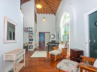 This home features the foyer with 20-foot ceilings, built in bookcases with ladders, glass windows, mahogany wood floors throughout, and a half bath and closet with storage, air conditioners and fans throughout.