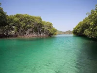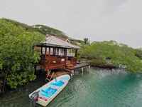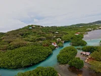 Escape to your own tropical retreat in Caribe Point Bight, Roatan! This 2-acre waterfront paradise features 500 feet of rocky shoreline, nestled right along the famous mangrove tunnels, known for their breathtaking beauty and bright turquoise waters. Perfect for kayaking and exploring the natural wonders of the island, these tunnels are a unique highlight of the area. The property includes a 1,408 sq. ft. (32x44) concrete main home with 3 bedrooms, tiled floors, and a spacious kitchen with tiled counters, perched on a hill with stunning views. Down by the water, there's a 480 sq. ft. (24x20) wooden guest house with 1 bedroom, 1 bathroom, and a large loft. An 8-foot covered porch invites relaxation, while a 400 sq. ft. (20x20) palapa sits directly on the water, perfect for enjoying