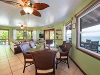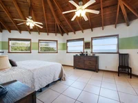 The open layout allows the ocean to be visible from the kitchen, dining and living areas connected to a covered deck facing Roatan's South Shore. On clear days, the mainland mountains make a feature appearance. A half bath and one of two master bedrooms with ensuite are located on the ground floor as well.