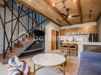 Step inside to an open-plan living and dining area finished with polished concrete floors, natural wood cabinetry, and woven bamboo ceilings. The living room includes a plush L-shaped sofa, a flat-screen TV, and glass doors that open directly to the pool, inviting sunlight and garden views inside. The compact kitchen is fully equipped with modern appliances, ideal for cooking at home. Upstairs, the bedroom features a king-size bed, blackout curtains, and a work desk—perfect for digital nomads. A stylish bathroom with a freestanding tub and sleek black-and-brass fixtures adds a refined touch.
