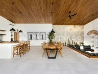 Outside, the villa opens up to a landscaped courtyard with a private swimming pool and sunbeds shaded by tropical greenery. A stylish gazebo and outdoor shower add to the appeal, providing a space to unwind and entertain. High sliding glass doors allow for seamless indoor-outdoor living, while vaulted wood-panel ceilings bring in plenty of natural light. The villa comes fully furnished and move-in ready, making it an easy turnkey opportunity for investors or homeowners alike.