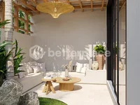 Stylish and impeccably designed, this two-bedroom villa offers a well-balanced layout across 100 m² of land and 112 m² of build. Two upper-floor en-suite bedrooms provide privacy and comfort, while the ground floor is anchored by a sunken lounge and a fully equipped kitchen with custom finishes. Materials throughout—terrazzo, natural stone, and warm wood—are chosen for their clean aesthetic and lasting quality.