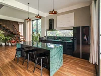 2-bedroom townhouse with an area of 132.7 m2 is characterized by a functional layout: a spacious living room with panoramic windows, a kitchen with appliances, 2 bedrooms with separate bathrooms, a balcony and a terrace for relaxation. The architecture is made in a modern style using natural materials, creating an atmosphere of coziness and harmony.