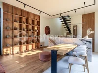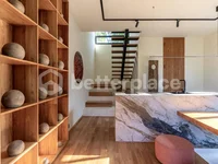Inside, the villa features an open-plan living and dining area with high ceilings and wide windows that allow natural light to pour in. The kitchen is finished with striking stone surfaces and sleek black fixtures, combining elegance and practicality. Floating timber stairs lead to the upper level, where two comfortable bedrooms with en-suite bathrooms provide privacy and calm. Each room is designed to maximize airflow and light, offering a refreshing indoor environment.