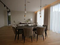 The house is fully equipped with furniture and household appliances. The open kitchen, a large living area and large windows facing the garden make spending time in the house as comfortable as possible. Separate economic zone. The bathroom has Grohe plumbing, bathroom on each floor. There are four isolated bedrooms on the second floor. There is a separate dressing room, which saves space for storing things. There are also built-in cabinets. Only high-quality and expensive materials are used in the decoration of the house.