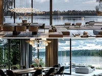 - Living floor (200 m² living area + 143 m² terraces): Spacious living room with panoramic windows and ceiling height up to 7.5m. Kitchen, dining area, bathroom, wardrobe, office.