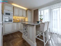 Modern classics interior pervaded by aesthetics and stylish details. The installation used the highest quality material: natural oak parquet, handmade oak kitchen furniture with fine gold details, natural granite surfaces, customized furniture. The feeling of elegance is also created by crystal lamps, decorative wall and ceiling stickers, and the elements of the stairs.
