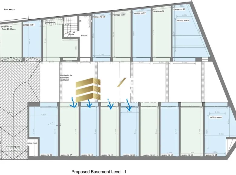 Garage B8 and B9 are both -2, 14.50m2, 31,000 euro Garage C47, C48, C49, C50 are all -1 and all are13.60m2, cost is 37,000 euro