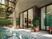 Designed by acclaimed architect Brandon Haw, this condo features warm wood accents, polished chukum plaster, and an earthy palette of ochre yellows and dusty pinks. Expansive living spaces flow effortlessly into private outdoor terraces, where forest greenery creates a serene retreat. Burnt sienna screens add privacy and elegance, while soft light fills the home with a tranquil ambiance.